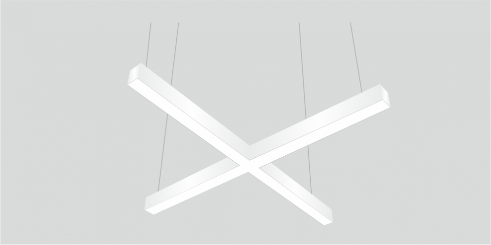 Светодиодный Лучевой светильник LiNE-Pro 4х500mm 80W 5000K белый предназначен для накладного или подвесного монтажа на тросовые подвесы. Изготовлен из сплошного сварного алюминиевого профиля в виде буквы «Х» (крестом). Высота установки светильника регулируется подвесом с цанговым тросовым зажимом и может варьироваться от 0,05 метра до 4 метров от основного потолка. Крестовой светильник имеет равномерную засветку по всей площади рассеивателя. Источник питания находится внутри корпуса. Торцевые заглушки входят в комплект. Возможно изготовление светильника с магистральной проводкой для соединения нескольких светильников в сплошную конструкцию.